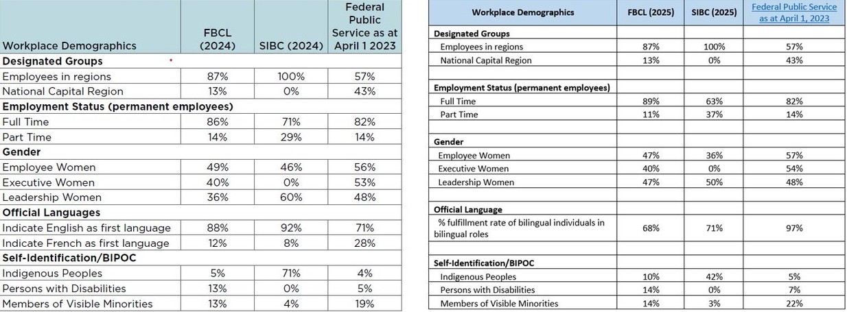 SIBC’s staff volume is too low for a statistically significant analysis of any of its employment parameters. While not driven by specific employment targets, SIBC benefits from a broadly diverse workforce. SIBC is a model employer in a number of notable employment categories including but not limited to gender and linguistic diversity of both staff and Board of Directors. More specifically, bilingualism is actively used at work, there is very visible and equitable representation from women in positions of authority; and other diversity factors such as age, disabilities, ethnicity (including Indigenous peoples) and different cultural backgrounds are well represented.